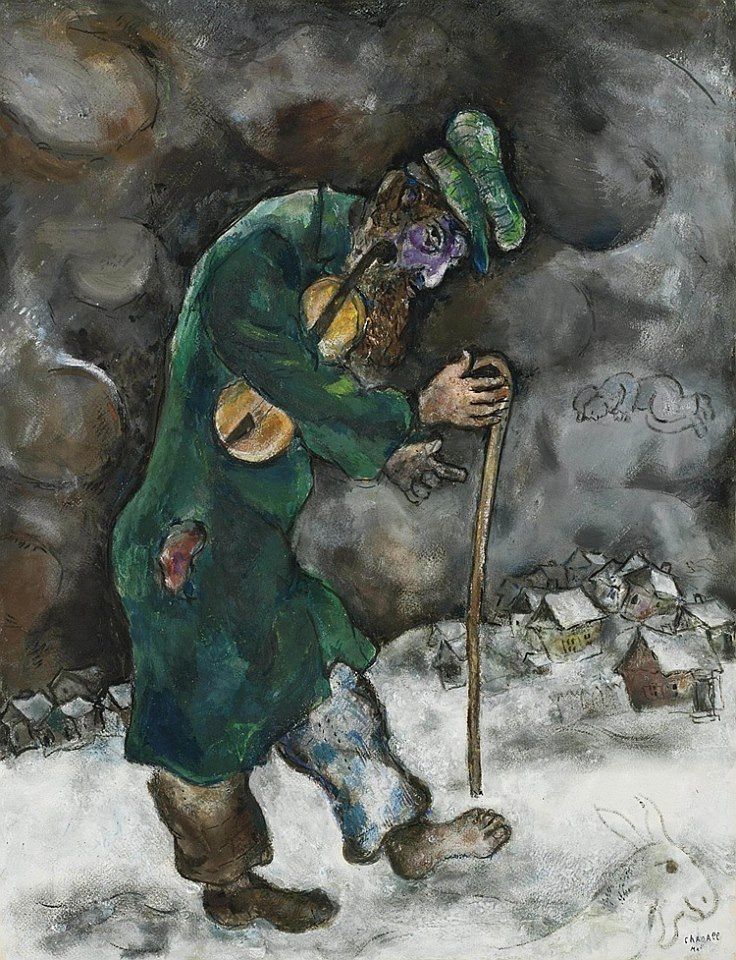 La mano floja del viejo judío está por dejar caer el bastón, que es sostén y es arma, y en un segundo cuadro –como cuadritos de historieta– el bastón habrá caído. Continuará en un tercer cuadro, donde el viejo se inclina para recoger el bastón pero al hacerlo aflojó la presión de su brazo sobre el violín, que es arte y sostén. Por eso, en el cuarto cuadro el violín cae. En el quinto cuadro, el violín ha sido abandonado. Finalmente, el judío es una silueta distante, apoyada en su bastón, y el violín se hundió en la nieve.